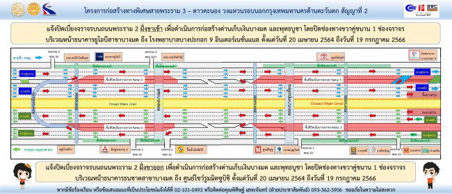 เนื่องจาก การทางพิเศษแห่งประเทศไทย จะดำเนินการก่อสร้างด่านเก็บเงินบางมด และด่านเก็บเงินพุทธบูชา ตามโครงการก่อสร้างทางพิเศษสายพระราม 3-ดาวคะนอง–วงแหวนรอบนอก กรุงเทพมหานคร ด้านตะวันตก สัญญาที่ 2 ซึ่งมีจำเป็นต้องปิดเบี่ยงการจราจร (ตลอด 24 ชม.) บนถนนพระราม 2 ในช่องทางขวาคู่ขนาน จำนวน 1 ช่องจราจร ทั้งฝั่งขาเข้าและขาออก โดยฝั่งขาเข้า ปิดเบี่ยงการจราจรเป็นบางช่วง ตั้งแต่บริเวณหน้าธนาคาร UOB สาขาบางมด ถึงโรงพยาบาลบางปะกอก 9 อินเตอร์เนชั่นแนล และฝั่งขาออก ปิดเบี่ยงการจราจรเป็นบางช่วง ตั้งแต่บริเวณหน้าธนาคารธนชาติ สาขาบางมด ถึง ศูนย์โชว์รูมมิตซูบิชิ เริ่มดำเนินการตั้งแต่วันที่ 20 เมษายน 2564 ถึงวันที่ 19 กรกฎาคม 2566 โดยระหว่างปิดเบี่ยงการจราจรช่วงบริเวณพื้นที่ก่อสร้างจะมีการขยายฟุตบาทเพื่อเพิ่มพื้นผิวการจราจรให้สามารถรองรับการสัญจรของผู้ใช้รถใช้ถนนได้ จำนวน 3 ช่องจราจร เช่นเดิม