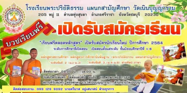 โรงเรียนพระปริยัติธรรมแผนกสามัญศึกษาวัดเนินบุญญาราม(ต้นมะม่วง) เปิดรับสมัคร ตั้งแต่วันนี้เป็นต้นไปจนถึงวันที่17 พฤษภาคม 2564 โดยเล่าเรียนฟรี มีที่พักพร้อม และสามารถติดต่อสอบถามทางโทรศัพท์ได้ที่065-2615396 พระมหา ดร.สาธิต อาภสฺสโร ผู้จัดการโรงเรียน