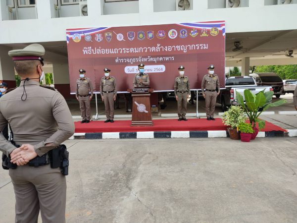 เมื่อวันที่ 5 เม ย. 64 ที่บริเวณกองบังคับการตำรวจภูธรจังหวัดมุกดาหาร พล.ต.ต. สรรธาน อิทรจักร์ ผู้บังคับการตำรวจภูธรจังหวัดมุกดาหาร , พ.ต.อ.เกียรติภูมิ สุวรรณไตรย์ ผกก.สภ.เมืองมุกดาหาร พร้อมด้วย ตำรวจภูธรจังหวัดมุกดาหาร กองกำกับสืบสวนสถานีตำรวจภูธรในสังกัด ตรวจคนเข้าเมืองมุกดาหาร พิสูจน์หลักฐาน ตชด.234 สถานีตำรวจทางหลวง 5 สถานีตำรวจท่องเที่ยว 4 กองร้อยทหารพรานที่ 2110 นรข.มุกดาหาร ฝ่ายปกครอง เทศบาลเมืองมุกดาหาร และมูลนิธิการกุศลจีหมกเกาะ เข้าร่วมพิธีปล่อยแถวระดมกวาดล้างอาชญากรรมในครั้งนี้ประมาณ 200 คน