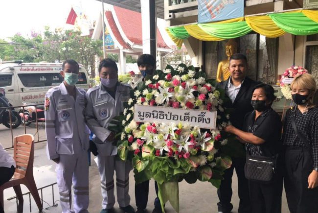 โดยคุณไปรเทพ ซอโสตถิกุล ได้มอบเงินส่วนตัวจำนวนหนึ่งแก่ญาติของอาสาสมัคร ทั้ง 3 ท่านเพื่อเป็นการช่วยเหลือเบื้องต้น โดยในวันเดียวกันนี้ มูลนิธิป่อเต็กตึ๊ง ได้จัดทีมบรรเทาสาธารณภัย นำพวงหรีดดอกไม้ร่วมแสดงความเสียใจกับญาติผู้เสียชีวิต และร่วมพิธีสวดพระอภิธรรมศพนายธนภพ ประไพ อาสาสมัครบรรเทาสาธารณภัยที่เสียชีวิตขณะปฏิบัติหน้าที่ ณ วัดนครอินทร์ จ.นนทบุรี
