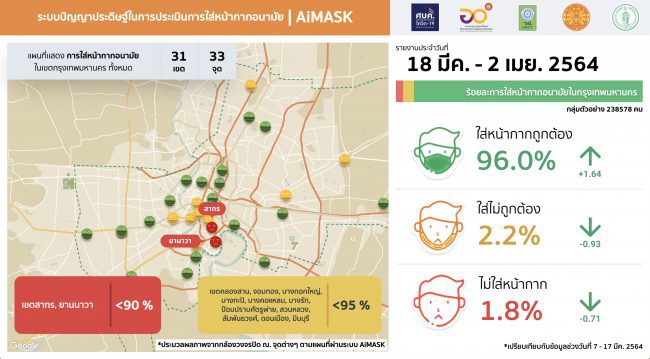 วันที่ 6 เมษายน 2564 : ศาสตราจารย์ ดร.ธนารักษ์ ธีระมั่นคง สถาบันเทคโนโลยีนานาชาติสิรินธร มหาวิทยาลัยธรรมศาสตร์ ร่วมกับสำนักงานการวิจัยแห่งชาติ (วช.) กระทรวงการอุดมศึกษา วิทยาศาสตร์ วิจัย และนวัตกรรม(อว.) รายงานผลการติดตามการใส่หน้ากากอนามัยโดยระบบปัญญาประดิษฐ์ (เอไอ) ว่าหลังเกิดคลัสเตอร์ตลาดบางแค ประชาชนให้ความสนใจและให้ความระมัดระวังมากขึ้น ทำให้มีแนวโน้มอัตราการใส่หน้ากากดีขึ้นมากอย่างต่อเนื่อง