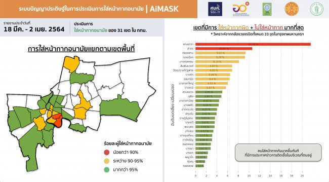 ในการใช้ระบบปัญญาประดิษฐ์ เอไอมาสต์ มาตั้งแต่ปลายเดือนมกราคม 2564 ที่ผ่านมา โดยทำการเฝ้าระวังการใส่หน้ากากอนามัยมาเป็น 33 จุด ครอบคลุม 31 เขตทั่วกรุงเทพฯ ในช่วงปลายเดือนมีนาคมนี้โดย พบว่าเขตยานนาวา มีประชาชนผู้สัญจรที่ไม่ใส่หน้ากากหรือใส่ไม่ถูกต้องมากที่สุดถึง 21.58% หรือสูงถึง 1 ใน 5 คน โดยถัดมาเป็นเขตสาทร ที่มีอัตราการใส่หน้ากากไม่ถูกต้องหรือไม่ใส่หน้ากากอนามัยสูงถึง 10.64% นอกจากนี้ยังมีเขตที่มีอัตราการไม่ใส่หน้ากากอนามัยหรือใส่ไม่ถูกต้องต่ำกว่า 10% แต่สูงกว่า 5% อยู่อีก 9 เขตคือ เขตคลองสาน (9.37%),เขตดอนเมือง (9.26%),เขตบางคอแหลม (8.14%),เขตสัมพันธวงศ์ (6.87%),เขตป้อมปราบศัตรูพ่าย (6.85%),เขตบางรัก (6.48%),เขตจอมทอง (6.40%),เขตบางกอกใหญ่ (6.03%) และเขตบางกะปิ (5.67%)
