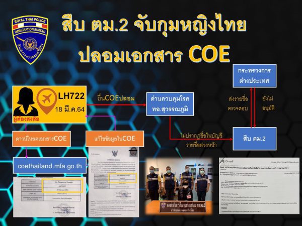 กก.สส.ปป.บก.ตม.2 ได้บูรณาการร่วมกับด่านควบคุมโรคติดต่อระหว่างประเทศและกักกันโรค ตรวจคัดกรองบุคคลที่เดินทางเข้ามาในราชอาณาจักรไทย โดยสายการบินลุฟท์ฮันซ่า เที่ยวบินที่ LH722 ซึ่งเดินทางมาจากประเทศเยอรมนี พบบุคคลต้องสงสัยเป็นหญิงไทย ถือหนังสือรับรองการเดินทางเข้าราชอาณาจักร ที่ออกให้โดยสถานกงสุลไทยประจำกรุงมิวนิค ประเทศเยอรมนี (Certificate Of Entry) หรือ COE เมื่อได้ตรวจสอบจากบัญชีรายชื่อผู้โดยสารคนไทยที่เดินทางกลับประเทศไทยในวันดังกล่าวไม่พบรายชื่อหญิงไทยรายนี้ จึงได้สอบถาม ผู้ต้องสงสัยยอมรับว่า ได้ทำการแก้ไข เพิ่มเติม ชื่อ-นามสกุล เลขที่หนังสือเดินทาง และวันเดินทางลงในเอกสาร COE เพื่อใช้ในการออกบัตรโดยสารเที่ยวบินดังกล่าว โดยดาวน์โหลดเอกสารเอกสาร COE จากเว็บไซต์ของสถานทูตไทยในประเทศเยอรมนี (coethailand.mfa.go.th)