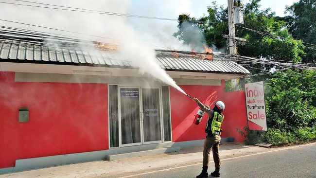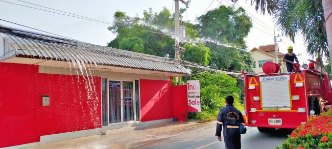 อากาศร้อน ไฟลุกไหม้สายส่งสัญญาณ หวิดวอดร้านเฟอร์นิเจอร์ควบคุมเพลิงได้ทัน