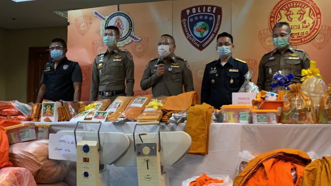วันที่ 8 เม.ย.64 เวลา 13.30 น. ที่ บก.ปคบ. : พล.ต.ต.ณัฐศักดิ์ เชาวนาศัย ผบก.ปคบ. พร้อมด้วยพ.ต.อ.เชษฐ์พันธ์ กิติเจริญศักดิ์ ผกก.1 บก.ปคบ.แถลงข่าวผลการตรวจยึดชุดสังฆทาน ชุดผ้าไตรจีวร ไม่ได้มาตรฐาน (ย้อมผ้าไตรจีวรเก่ามาทำใหม่หลอกขายผู้บริโภค) พร้อมของกลางจำนวนหลายรายการ