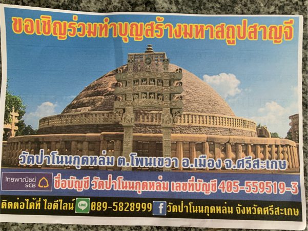 ร้อยตรี ภาณุพงษ์ สุทธิสาร อดีต ผอ.สำนักงานปกครองและทะเบียน กรุงเทพมหานคร กล่าวว่า คณะญาติธรรมวัดป่าโนนกุดหล่ม ได้ฝากกราบนิมนต์พระภิกษุสามเณร และขอเชิญอุบาสกอุบาสิกาสาธุชนคนดีทั่วประเทศมาร่วมกันทำบุญทอดผ้าป่าสมทบทุนสร้างมหาสถูปสาญจี ร่วมปักหมุดเสาเข็มสถูปสาญจี เพื่อแสดงออกถึงความรัก ความกตัญญูต่อ ประเทศชาติ ศาสนา พระมหากษัตริย์ บรรพบุรุษ ตลอดถึง พระเจ้าอโศกมหาราชผู้ทรงส่งสมณะทูต เผยแผ่พระศาสนาไปทั่วโลก ทำให้พระพุทธศาสนา เจริญรุ่งเรืองมาจนถึงทุกวันนี้ ขอเชิญพุทธศาสนิกชนร่วมให้ทาน รักษาศีล เจริญเมตตา ภาวนา ฟังธรรม ร่วมเปิดวัดศูนย์การเรียนรู้ของวัดบันดาลใจด้วย
