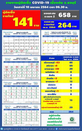 วันนี้ (10 เม.ย.2564) สำนักงานสาธารณสุขจังหวัดชลบุรี รายงานสถานการณ์ COVID-19 ในพื้นที่ จ.ชลบุรี วันนี้มีผู้ป่วย COVID-19 ยืนยันรายใหม่ 141 คน มีผู้สัมผัสผู้ที่ยังไม่ทราบประวัติแน่ชัด 6 คน ค้นหาเชิงรุกอีก 1,538 คน อยู่ระหว่างรอผลตรวจดังนี้
