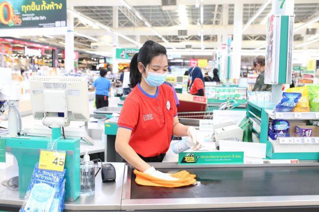 - ทำความสะอาดและฆ่าเชื้อพื้นผิวทุกบริเวณเป็นประจำทุก ๆ 2 ชั่วโมง อาทิ เคาน์เตอร์แคชเชียร์ ราวจับบันไดเลื่อน ปุ่มกดลิฟต์ รถเข็นและตะกร้าช้อปปิ้ง บัตรศูนย์อาหารและบัตรจอดรถ (ทุกครั้งหลังการใช้) รวมถึงห้องน้ำ