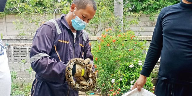 ที่เกิดเหตุพบคุณยาย อ๊ง อุตเสน อายุ87 ปี พร้อมกับหลานสาว ยืนรอเจ้าหน้าที่ด้วยอาการตกใจ พร้อมพาเจ้าหน้าที่ไปยังจุดที่งูเหลือมติดตาข่ายพบว่าเป็นกรงนก ที่ด้านใน มีนกสายพันธุ์ แอฟริการเกรย์ อยู่ภายในกรง ซึ่งทางเจ้าของบ้านได้เลี้ยงไว้ จากนั้นเจ้าหน้าที่ได้ทำการ จับเจ้างูเหลือม เพื่อปลดตาข่ายออกจากตัวงู โดยงูมีความยาวประมาณ 1 เมตร ลำตัวไม่ใหญ่มาก ซึ่งคาดว่ากำลังจะเลื้อยเพื่อที่จะเข้ามากินนกที่เลี้ยงไว้ในกรง แต่ติดตาข่ายเลื้อยออกไม่ได้ แต่หากกินนกเข้าไปรับรองลำตัวใหญ่แน่นอน