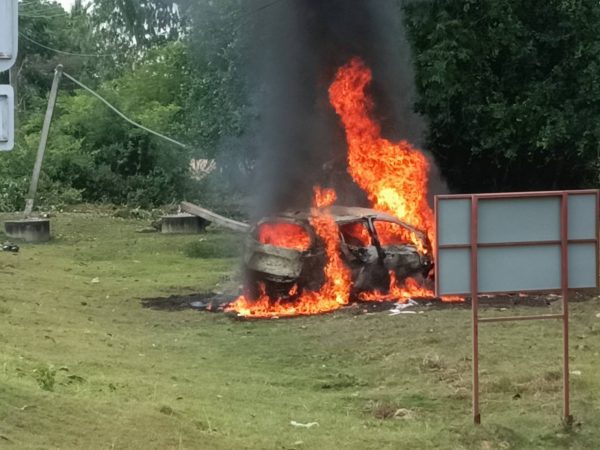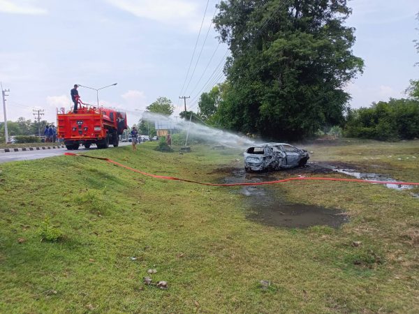 ศรีสะเกษ !! ภาพเหตุการณ์รถยนต์เสียหลักตกลงข้างทางเกิดเพลิงไหม้วอดทั้งคัน ตำรวจช่วยคนขับออกจากรถรอดตายปาฏิหาริย์