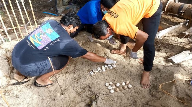 เมื่อเวลา 07.00 น.วันที่ 3 พ.ค. 64 ที่บริเวณชายทะเลเขาไม้รวก หมู่ที่ 9 บ้านโคกตาหอม ตำบลอ่างทอง อำเภอทับสะแก จังหวัดประจวบคีรีขันธ์ นายสุรศักดิ์ ทองสุกดี ผอ. ศูนย์วิจัยทรัพยากรทางทะเลและชายฝั่งอ่าวไทยตอนบนฝั่งตะวันตก นายมนตรี หามนตรี ผอ.ส่วนอนุรักษ์ทรัพยากรทางทะเล ได้สั่งการให้เจ้าหน้าที่ศูนย์อนุรักษ์ทรัพยากรทางทะเลจังหวัดประจวบคีรีขันธ์ ประสาน นายประชุม เสือเหลือง ผู้ใหญ่บ้านหมู่ที่ 9 บ้านโคกตาหอม นายเกริกเกียรติ ลาภอาภารัตน์ ประธานประมงชุมชนตำบลอ่างทอง นายจำปี ศรีคำ ผู้ดูแลเต่า เข้าตรวจสอบเต่าตะนุที่ขึ้นวางไข่ชายหาดเขาไม้รวก โดยในวันนี้เป็นวันครบกำหนดที่เต่าฟักออกจากไข่ จำนวน 1 รัง รวม 88 ฟอง