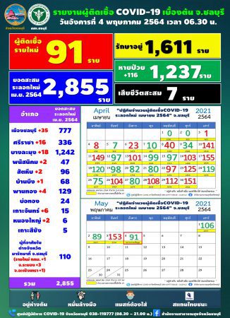 วันที่ 4 พ.ค.64 สสจ.ชลบุรี มีรายงานผู้ติดเชื้อโควิด-19 รายใหม่ จำนวน 91 ราย จาก 1. ให้ประวัติพักอาศัยใน กทม. เดินทางมาตรวจเพื่อรักษา 1 ราย 2. วงสังสรรค์ในจังหวัด 4 ราย 3. อาชีพเสี่ยงพบปะผู้คนจำนวนมาก 2 ราย 4. สัมผัสผู้ป่วยยืนยัน 4.1 จาก Cluster งานศพ 3 ราย 4.2 ในครอบครัว 5 ราย 4.3 จากที่ทำงาน 2 ราย 5. ผู้สัมผัสผู้ป่วยยืนยัน มีประวัติเดินทางไปต่างจังหวัด 5.1 กทม. 7 ราย 5.2 จ.ระยอง 2 ราย 5.3 จ.ปราจีนบุรี 1 ราย 6. ผู้สัมผัสผู้ป่วยยืนยัน ซึ่งอยู่ระหว่างสอบสวนโรค 34 ราย 7. อยู่ระหว่างการสอบสวนโรค 30 ราย