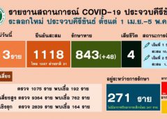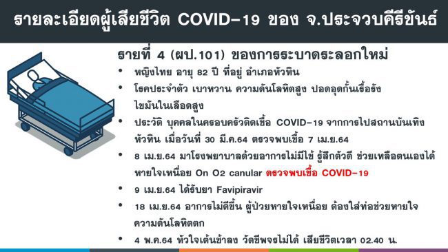 วันที่ 5 พฤษภาคม นายแพทย์สุริยะ คูหะรัตน์ นายแพทย์สาธารณสุขจังหวัด (สสจ.) ประจวบคีรีขันธ์ เปิดเผยว่า ขณะนี้มีผู้ป่วยยืนยันติดเชื้อโควิด 19 รายใหม่ 13 ราย มียอดสะสมผู้ป่วย 1118 คน รักษาหายแล้ว 8437 คน อยู่ระหว่างการรักษา 271 คน ผู้ป่วยที่เข้ารับการรักษาที่ รพ.หัวหินเสียชีวิตเพิ่ม 1 ราย รวมยอดเสียชีวิตสะสมตั้งแต่วันที่ 1 เมษายนที่ผ่านมา รวม 4 ราย สำหรับผู้เสียชีวิตรายล่าสุดเป็นผู้ป่วยเพศหญิงรายที่ 101 อายุ 82 ปี มีโรคประจำตัวเบาหวาน ความดันโลหิตสูง ไขในในเลือดสูง มีประวัติติดเชื้อเมื่อวันที่ 8 เมษายน 2564 จากบุคคลในครอบครัวที่ติดเชื้อโควิด 19 จากการเที่ยวผับแห่งหนึ่งเมื่อคืนวันที่ 30 มีนาคม 2564