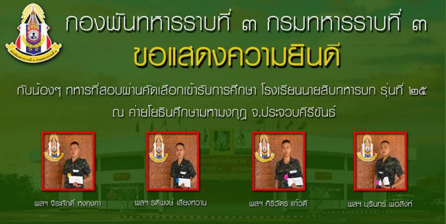 ซึ่งก่อนเดินทางนั้น พันโท ศรณณัฐ นวลมณี ผู้บังคับกองพันทหารราบที่ 3 กรมทหารราบที่ 3 (ผบ.ร.3 พัน 3) ได้แสดงความยินดีพร้อมทั้งได้มอบขวัยและกำลังใจให้กับน้องๆ ทหารของหน่วย จำนวน 4 นาย ที่สามารถผ่านการทดสอบ ผ่านเข้าศึกษา ณโรงเรียนนายสิบทหารบก (รุ่นที่ 25) และกล่าวให้โอวาท เพื่อเป็นขวัญและกำลังใจให้กับกำลังพล โดยได้เน้นย้ำการใช้ความรู้ความสามารถที่หน่วย ไปปรับใช้ในชีวิตการเป็นนักเรียนให้เกิดประโยชน์ การปฏิบัติตัวในการเข้ารับการศึกษาจากโรงเรียนนายสิบทหารบก และตั้งใจศึกษาเรียนรู้ ให้มีมุ่งมั่นพยายามศึกษาหาความรู้ให้ได้มากที่สุด เพื่อให้สามารถนำความรู้ที่ได้รับการศึกษานำมาต่อยอดความรู้สู่การเป็นกำลังพลหลักในการพัฒนาหน่วยทหารในกองทัพบก สร้างความภาคภูมิ ให้ตนเองและครอบครัว เป็นแบบอย่างความสำเร็จในการสอบคัดเลือกเข้าเป็นนักเรียนนายสิบทหารบกและบรรจุเป็นนายทหารประทวนสังกัดกองทัพบกของหน่วยต่างๆ รวมถึงการรับราชการทหารซึ่งเป็นอาชีพที่มั่นคง ทั้งต่อตัวเอง ครอบครัว ในอนาคตต่อไป