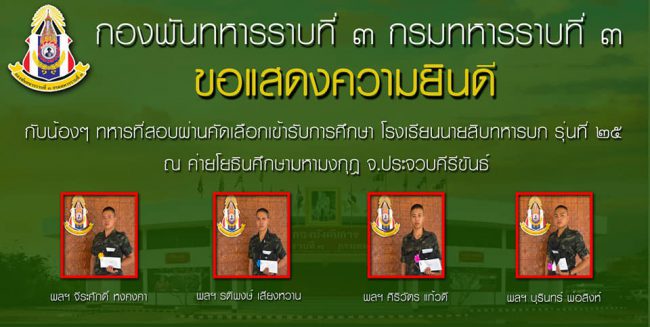 ผบ.ร.3 พัน.3 แสดงความยินดีกับน้องๆ ทหารของหน่วย ที่สามารถผ่านการทดสอบ ผ่านเข้าศึกษา ณ โรงเรียนนายสิบทหารบก (รุ่นที่ 25) ค่ายโยธินศึกษามหามงกุฏ จ.ประจวบคีรีขันธ์ ได้สำเร็จ