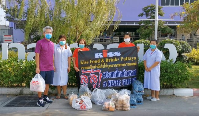 จึงได้นำอาหารคาวหวานมามอบให้เป็นกำลังใจ ประกอบด้วย พิซซ่า, น้ำดื่ม, กล้วยน้ำว้า และขนมหวงาน เป็นต้น หวังส่งมอบพลังแห่งความสุขนี้ เพื่อให้ทีมหมอ พยาบาล จะมีแรงในการปฏิบัติหน้าที่สู้กับโรคร้ายต่อไป สำหรับคิส ฟู้ด แอนด์ ดริ้ง พัทยา นับว่าเป็นร้านอาหารที่ได้รับความนิยมจากประชาชนทั้งใน และนอกพื้นที่ ซึ่งปัจจุบัน เปิดให้บริการทั้งสิ้น 4 สาขา ประกอบด้วย สาขาพัทยานาเกลือ บริเวณซอย 27, สาขาถนนพัทยาสาย 2 ด้านหลังไมค์ ช้อปปิ้ง มอลล์, สาขาซอยสยามคันทรี คลับ บริเวณด้านหลังโรงเรียนสว่างบริบูรณ์ฯ และสาขาถนนจอมเทียนสาย 2 บริเวณตลาดร่มโพธิ์ ซึ่งปัจจุบัน ทางร้านได้ปิดให้บริการในส่วนของการนั่งรับประทานที่ร้าน แต่ยังคงเปิดให้บริการซื้อกลับบ้าน ตามนโยบายของ ศบค. ในการเฝ้าระวัง และป้องกันการแพร่ระบาดของโรคโควิด-19 ระลอกเมษายน…