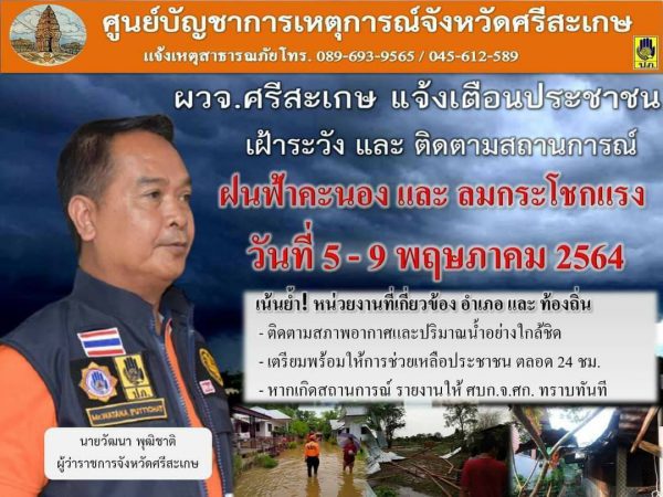 นายบุญประสงศ์ นวลสายย์ ปภ.จังหวัดศรีสะเกษ กล่าวว่า เมื่อวันที่ 5 พฤษภาคม 2564 เวลา 17.00 – 21.00 น. ได้เกิดวาตภัย ใน พท. รวม 3 อำเภอ 9 อปท. 18 หมู่บ้าน ทำให้บ้านเรือนได้รับความเสียหายสำรวจเบื้องต้น ดังนี้ ประกอบด้วย อำเภอกันทรลักษ์ ในพินที่เขตเทศบาลเมืองกันทรลักษ์ ตำบลหนองหญ้าลาด ตำบลน้ำอ้อม และตำบลตระกาจ ทำให้บ้านเรือนได้รับความเสียหาย จำนวน 37 หลัง พืชผลการเกษตรเป็นจำนวนมาก อำเภอเมืองศรีสะเกษ ในเขตเทศบาลเมืองศรีสะเกษ และตำบลหนองไผ่ ทำให้บ้านเรือนได้รับความเสียหาย จำนวน 10 หลัง และอำเภอโพธิ์ศรีสุวรรณ ในพื้นที่ตำบลโดด ตำบลเสียว และตำบลหนองม้า ทำให้บ้านเรือนได้รับความเสียหาย 12 หลัง และหลังอาอาคารของ โรงพยาบาลโพธิ์ศรีสุวรรณ และอาคารของ โรงเรียนบ้านจาน ได้รับความเสียหายด้วย นอกจากนี้ยังมีต้นไม้หักโค่นล้มกีดขวางการจราจรหลายจุด ซึ่งส่วนราชการที่เกี่ยวข้องได้ดำเนินการในส่วนที่เกี่ยวข้องเรียบร้อย สามารถสัญจรไปมาได้ปกติแล้ว ในการนี้ อำเภอ/ อปท. ได้ดำเนินการให้ความช่วยเหลือเบื้องต้น และจะเร่งสำรวจความเสียหาย และให้ความช่วยเหลือตามระเบียบ หลักเกณฑ์ที่เกี่ยวข้องต่อไป