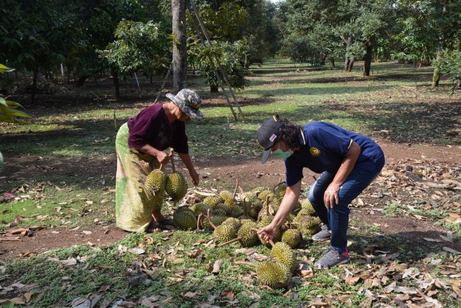 เมื่อเวลา 15:00 น. วันที่ 6 พฤษภาคม 2564 ผู้สื่อข่าวรายงานว่า ที่สวนตาบุญทันยายกล่อง บ้านซำตารมย์ ต.ตระกาจ อ.กันทรลักษ์ จ.ศรีสะเกษ นางสาวสายชล เครือแก้ว กำนันตำบลตระกาจ ได้ออกสำรวจความเสียหายสวนทุเรียนภูเขาไฟที่ได้รับผลกระทบจากการเกิดลมพายุพัดโหมกระหน่ำในเขต ต.ตระกาจ เมื่อช่วงใกล้ค่ำของวันที่ 5 พฤษภาคมที่ผ่านมาซึ่งจากการสำรวจพบว่าเกษตรกรชาวสวนทุเรียนภูเขาไฟกำลังช่วยกันเดินเก็บลูกทุเรียนภูเขาไฟที่หล่นลงมากองอยู่กับพื้นและเก็บรวบรวมนำเอาไปกองรวมกันไว้จำนวนมาก ซึ่งทุเรียนเหล่านี้จะสุกภายในเดือนมิถุนายนที่จะถึงนี้และพร้อมที่จะนำออกสู่ท้องตลาด เพื่อจำหน่ายให้กับผู้บริโภคที่ชื่นชอบทุเรียนภูเขาไฟโดยเกษตรกรต่างมีใบหน้าที่เศร้าหมองเนื่องจากว่าในปีนี้ปลูกทุเรียนโดนลมพายุพัดต้นทุเรียนรุนแรงกว่าทุกปีที่ผ่านมาทำให้ลูกทุเรียนร่วงหล่นเป็นจำนวนมาก ซึ่งลูกทุเรียนภูเขาไฟที่เก็บมากองรวมกันไว้ได้มีการแบ่งปันไปให้ประชาชนทั่วไปในเขต อ.กันทรลักษ์ได้มารับเอาไป ทั้งนี้เพื่อจะได้นำเอาไปประกอบอาหารจำพวกของหวานและขนมหวานทอดกรอบต่าง ๆเป็นการแบ่งปันความสุขให้กับประชาชนทั่วไปในช่วงที่มีการแพร่ระบาดของเชื้อไวรัสโควิด-19 แม้ว่าเกษตรกรจะมีความเสียดายมากที่ผลผลิตทุเรียนภูเขาไฟต้องร่วงหล่นจำนวนมากแต่หากเก็บเอาไว้ก็คงจะไม่สามารถที่จะนำเอาไปใช้ประโยชน์ได้หมดจึงต้องแจกจ่ายให้กับคนทั่วไป