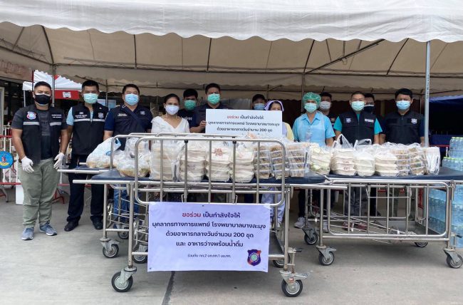วันที่ 8 พ.ค.2564 ณ โรงพยาบาลบางละมุง ตำบลนาเกลือ อำเภอบางละมุง จังหวัดชลบุรี พันตำรวจโท ปิยะพงษ์ รักษา สารวัตรกองกำกับการ 2 กองบังคับการตำรวจท่องเที่ยว 1, ร้อยตำรวจเอกอภิชาติ จารุรักษ์ รอง สารวัตรกองกำกับการ 2 กองบังคับการตำรวจท่องเที่ยว 1 พร้อมคุณจิตริณี แก้วจินดา และคุณภิพัชรา แก้วจินดา ได้นำขนมกุยช่ายอาม่าพัทยา และขนมจีบ-ซาลาเปา รวม 40 ชุด นำไปมอบให้กับบุคลากรทางการแพทย์ ที่ปฏิบัติงาน เพื่อเป็นกำลังใจในการสู้วิกฤตโควิด-19 ในระลอกสาม ที่เกิดการแพร่ระบาดอย่างรวดเร็ว มีผู้ติดเชื้อจำนวนมาก ทำให้ทุกภาคส่วนต่างได้รับผลกระทบถ้วนหน้า โดยเฉพาะอย่างยิ่งบุคลากรทางการแพทย์ ที่ต้องปฏิบัติหน้าที่อย่างหนัก ในการรับส่ง-ดูแลรักษาผู้ป่วย