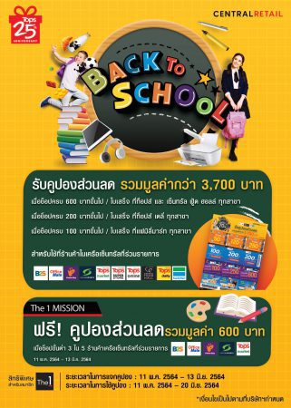 รับทันทีคูปองส่วนลด Back to School มูลค่ารวมกว่า 3,700 บาท เมื่อซื้อสินค้าครบ 600 บาทขึ้นไป/ใบเสร็จ ที่ท็อปส์ มาร์เก็ต, ท็อปส์ ซูเปอร์สโตร์, เซ็นทรัล ฟู้ด ฮอลล์ทุกสาขา และท็อปส์ ออนไลน์ หรือซื้อครบ 200 บาทขึ้นไป/ใบเสร็จ ที่ท็อปส์ เดลี่ทุกสาขา หรือครบ 100 บาทขึ้นไป/ใบเสร็จ ที่แฟมิลี่มาร์ททุกสาขา เพื่อใช้เป็นส่วนลดสำหรับใช้ในร้านค้าเครือเซ็นทรัลที่ร่วมรายการ เช่น ท็อปส์ แฟมิลี่มาร์ท บีทูเอส ซูเปอร์สปอร์ต เพาเวอร์บาย ออฟฟิศเมท ตั้งแต่วันที่ 11 พฤษภาคม – 13 มิถุนายน 2564 พิเศษ ! สมาชิกเดอะวัน ทำภารกิจ “It’s time for school” สำเร็จในแอปพลิเคชั่น The 1 ภายในวันที่ 13 มิถุนายน 2564 รับฟรีคูปองส่วนลดเพิ่มเติมจากร้านค้าที่ร่วมรายการ มูลค่ารวม 600 บาท