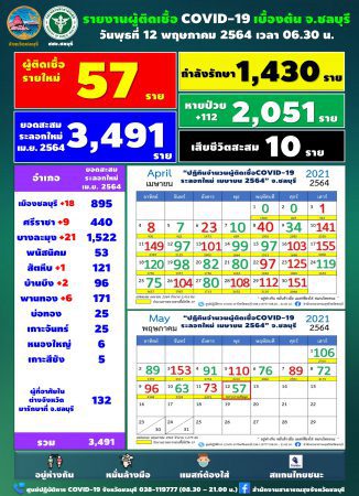 วันนี้ 12 พ.ค.64 โควิดชลบุรี บางละมุง ยังแชมป์ 21 ราย ยอดป่วยสะสม 3,491 ราย มีรายงานผู้ติดเชื้อโควิด-19 รายใหม่ จำนวน 57 ราย 1. สัมผัสผู้ป่วยยืนยัน 1.1 ในครอบครัว 12 ราย 1.2 จากที่ทำงาน 6 ราย 2. ผู้สัมผัสผู้ป่วยยืนยัน ซึ่งอยู่ระหว่างสอบสวนโรค 14 ราย 3. อยู่ระหว่างการสอบสวนโรค 25 ราย