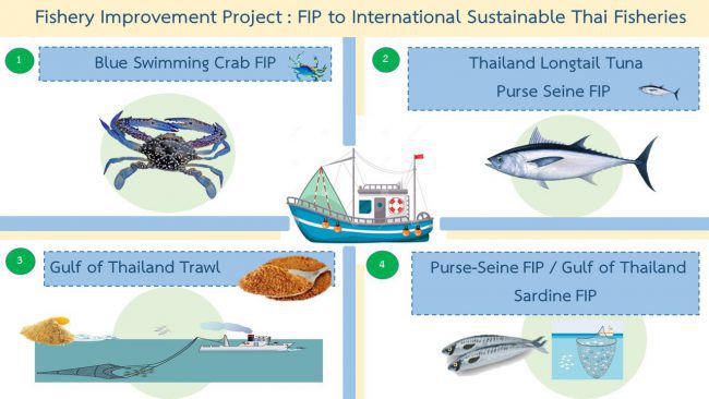 ทั้งเรื่องการไม่ได้ใช้เครื่องมือแยกเต่าทะเล (TEDs) การทำประมงผิดกฎหมาย ขาดการรายงานและไร้การควบคุม (IUU) การนำเข้าสินค้าสัตว์น้ำเพื่อคุ้มครองสัตว์ทะเลเลี้ยงลูกด้วยนม (MMPA) ซึ่งหลายเรื่องเป็นเรื่องใหม่สำหรับการประมงในประเทศไทย ส่งผลให้วัตถุดิบที่เข้าสู่อุตสาหกรรมประมงต้องมาจากการทำประมงอย่างความรับผิดชอบ การประมงยั่งยืน และการประมงที่ถูกกฎหมาย ไม่ทำลายสิ่งแวดล้อม เกื้อกูลต่อวิถีชีวิตดั้งเดิมของชุมชน จึงมีความจำเป็นอย่างยิ่งที่จะต้องเร่งยกระดับการจัดการประมงและระบบการผลิตสินค้าประมงของไทยให้ได้มาตรฐานสากลและเป็นที่ยอมรับของนานาชาติ ในด้านการจัดหาวัตถุดิบที่มาจากการประมงที่มีความรับผิดชอบ มีผลกระทบต่อระบบนิเวศน้อยที่สุด เกิดความยั่งยืนของทรัพยากรประมง ก่อให้เกิดประโยชน์สูงสุดต่อทุกภาคส่วนในห่วงโซ่อุปทาน และสามารถตรวจสอบกลับได้ และการสร้างความเข้าใจในการบริหารจัดการเพื่อความยั่งยืนของทรัพยากรเป็นสิ่งสำคัญที่ Fisheries Improvement Program (FIP) กำหนดเป็นตัวชี้วัดสำคัญ สิ่งที่ต้องการขับเคลื่อนของภาครัฐเป็นใหญ่โดยมีการทำงานใกล้ชิดกับชุมชน และทุกๆ ภาคส่วน เพื่อเรียนรู้ที่จะใช้ทรัพยากรอย่างยั่งยืนและเกิดสมดุลของระบบนิเวศ