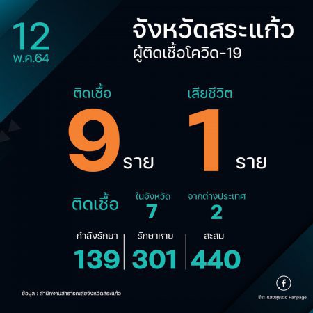 จังหวัดสระแก้ว เสียชีวิตจากโควิด-19 แล้ว 1 ราย ที่ รพ.สมเด็จพระยุพราชสระแก้ว และพบผู้ติดเชื้อรายใหม่ 9 ราย สะสม 449 ราย