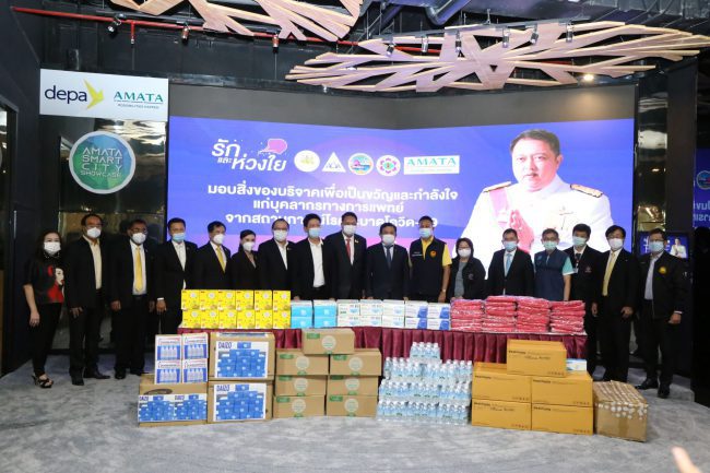 นอกจากนี้ นายสุชาติ ชมกลิ่น รัฐมนตรีว่าการกระทรวงแรงงาน ยังได้ส่งมอบสิ่งของที่ได้รับบริจาคมาจากผู้ประกอบการภายในนิคมอุตสาหกรรมอมตะฯ อาทิ ชุด PPE หน้ากากอามัย เจลแอลกอฮอลล์ ขนม น้ำดื่ม และอื่นๆ ให้แก่ บุคลากรทางการแพทย์ เพื่อนำไปใช้งานเป็นขวัญและกำลังใจในการปฏิบัติงานภายใต้สถานการณ์โรคระบาดโควิด 19 ต่อไป