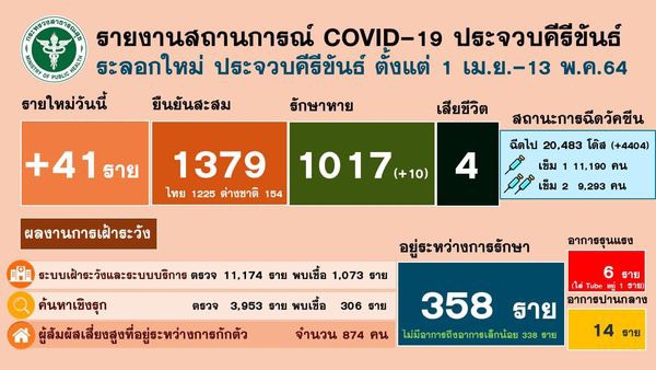 วันที่ 13 พฤษภาคม นายแพทย์สุริยะ คูหะรัตน์ นายแพทย์สาธารณสุขจังหวัด (สสจ.)ประจวบคีรีขันธ์ เปิดเผยว่า ขณะนี้พบผู้ติดเชื้อรายใหม่ 41 ราย ยืนยันสะสม 1,379 ราย เป็นไทย 1,225 ราย ต่างชาติ 154 ราย รักษาหาย 1,017 ราย อยู่ระหว่างการรักษา 358 ราย สำหรับผู้ติดเชื้อรายใหม่เป็นคนไทย 18 ราย แรงงานชาวพม่า 23 ราย มีความเชื่อมโยงกับการติดเชื้อในร้านอาหารยาโยอิ ภายในห้างหัวหินมาเก็จวิลเลจ และการติดเชื้อโควิดภายในโรงงานสับปะรดกระป๋องบริษัท ควอลิตี้ ไพน์แอปเปิ้ล โปรดักส์ ริมถนนบายพาสชะอำ-ปราณบุรี หมู่ที่ 3 บ้านหนองนกน้อย ต.หินเหล็กไฟ อ.หัวหิน สำหรับโรงงานแห่งนี้มีผู้ติดเชื้อรวม 166 ราย ก่อนหน้านี้นำไปรักษาที่ รพ.สนามใกล้ รพ หัวหิน ส่วนผู้ที่ติดเชื้อรายใหม่ให้พักดูอาการภายในโรงอาหาร ภายในโรงงาน ซึ่งปรับเป็น รพ.สนาม รองรับผู้ติดเชื้อที่มีแนวโน้มเพิ่มขึ้น จากจำนวนผู้มีความเสี่ยงสูง 402 ราย และมีคำสั่งจังหวัดให้กันตัวในโรงงานตั้งแต่วันที่ 7 – 20 พฤษภาคม 2564