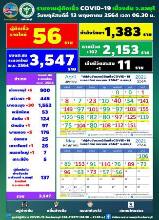 วันนี้ 13 พ.ค.64 มีรายงานผู้ติดเชื้อโควิด-19 รายใหม่ จำนวน 56 ราย จาก  1. สัมผัสผู้ป่วยยืนยัน  1.1 ในครอบครัว 8 ราย  1.2 จากที่ทำงาน 7 ราย  2. ผู้สัมผัสผู้ป่วยยืนยัน ซึ่งอยู่ระหว่างสอบสวนโรค 12 ราย  3. อยู่ระหว่างการสอบสวนโรค 29 ราย  มีผู้ป่วย โควิด 19 ยอดสะสมระลอกใหม่ 3,547 ร่ย รักษาหายแล้ว 2,153 ราย กำลังรักษาตัว 1,383 ราย เสียชีวิตสะสม 11 ราย