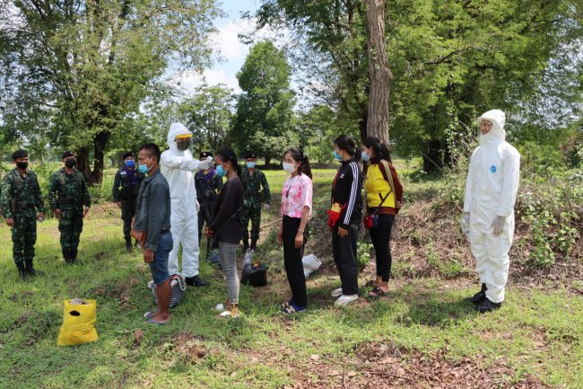 กระทั่งเวลา 06.00 น.วันนนี้ ได้ออกตรวจมาถึงบริเวณบ้านโคกสูง ต.โคกสูง อ.โคกสูง จ.สระเเก้ว ริมชายแดนพบกลุ่มแรงงานกำลังเดินลัดเลาะแนวป่าข้ามชายแดนมาได้ จึงได้เข้าทำการสกัด ได้ 6 คน เป็นแรงงานชาวกัมพูชาทั้งหมด เป็นชาย2 หญิง 4 คน พร้อมผู้นำพาชาวกัมพูชา กำลังอีกสาย ได้ออกตรวจ มาถึงบริเวณบ้านทัพเซียมและบริเวณบ้านหนองหญ้าแก้ว ได้ตรวจพบกลุ่มแรงงานเช่นกัน บนถนนลูกรัง อยู่ห่างจากถนนสายหลัก 200 เมตร บ้านทัพเซียม ต.ตาพระยา อ.ตาพระยา จ.สระแก้ว จนท.จึงได้แสดงตัวเพื่อขอตรวจค้น พบเป็นคนต่างด้าวสัญชาติกัมพูชา 23 คน (ช.14 ญ.9 ) โดยทั้งหมดสวมหน้ากากอนามัยกันทุกคน จึงได้ขอตรวจสอบเอกสารการเข้ามาในประเทศ ไม่พบเอกสารการเข้าเมืองมาแสดงได้ เจ้าหน้าที่จึงได้จับกุม และควบคุมตัว มาสอบสวนเพิ่มเติมที่ ร้อย.ฉก.ตชด.3และจากการสอบสวน ทราบว่า เริ่มออกเดินเท้ามาจากกัมพูชาตั้งแต่เมื่อวาน โดยมีคนนำพาเป็นชาวเขมร พาเดินเข้ามา จากบ้านแต้ ต.สวายเจ็ก อ.สวายเจ็ก จ.บันเตียนเมียนเจยเดินลัดเลาะในภูมิประเทศและหลบหลีกการตรวจการของทหารกัมพูชา และข้ามฝั่งมาบนถนนศรีเพ็ญ บริเวณช่องทางธรรมชาติ และเดินลัดเลาะมาตามถนนทางลูกรังจนมาถึงจุดที่จับได้ รวมทั้งหมด 29 คน ให้การว่า จะไปหาทำงาน ในกทม.สมุทรปราการ,ชลบุรี,ระยอง,จันทบุรี โดยจะมีรถมารับไปส่งที่ยังปลายทาง และเมื่อถึงที่หมายปลายทางแล้วจะจ่าย คนละ 4,500 บาท