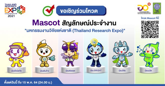 ขอเชิญร่วมโหวต Mascot สัญลักษณ์ประจำงาน “มหกรรมงานวิจัยแห่งชาติ (Thailand Research Expo)” 6 รูปแบบ 6 สไตล์ พร้อมสื่อความหมายสื่อนวัตกรรมแบบใหม่ ผ่านเรื่องราวของงานวิจัยไทย