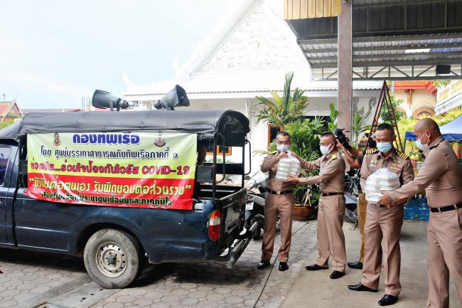 โดยทัพเรือภาคที่ 1 ได้สนับสนุนยานพาหนะและกำลังพล เพื่อนำอาหารปรุงสุกส่งมอบให้กับประชาชน ที่ได้รับความเดือดร้อนจากการแพร่ระบาดของเชื้อไวรัสโควิด 19 พร้อมทั้งมีดำริให้ ทัพเรือภาคที่ 1 จัดขนมหวานแพคใส่กล่อง วันละ 300 กล่อง สนับสนุนครัวสนามรักสัตหีบ ร่วมนำแจกจ่ายให้กับประชาชนถึงบ้านในโอกาสเดียวกันนี้ด้วย
