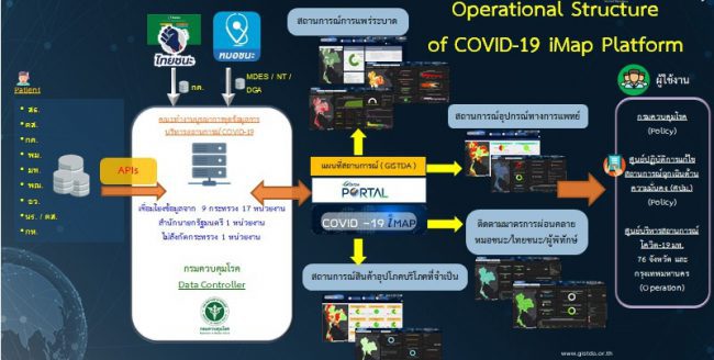 นายตติยะ ชื่นตระกูล รองผู้อำนวยการ สำนักพัฒนาเทคโนโลยีอวกาศและภูมิสารสนเทศ หรือ จิสด้า (GISTDA) เปิดเผยว่า เมื่อเกิดการระบาดของโควิด-19 ในรอบแรก GISTDA ได้พัฒนาระบบข้อมูลที่เรียกว่า COVID-19 iMap ซึ่งเป็นระบบเชื่อมโยงข้อมูลด้านภูมิสารสนเทศจากหลายหน่วยงานที่เกี่ยวข้อง ซึ่งมีปริมาณข้อมูลอยู่เป็นจำนวนมาก เพื่อนำมาเสนอในรูปแบบของแผนที่ดิจิทัลและแดชบอร์ด (Dash Board: เป็นการนำข้อมูลมาสรุปให้เห็นเป็นภาพในหน้าเดียว) โดยนำภาพจากดาวเทียมมาใช้ประกอบการกำหนดพื้นที่เสี่ยงต่อการแพร่ระบาด และรายงานสถานการณ์เกี่ยวกับผู้ติดเชื้อรายอำเภอ รายจังหวัด การกระจายตัวของโรค หน้ากากอนามัยฯ ในพื้นที่ต่างๆ เพื่อสนับสนุนการทำงาน ประกอบการตัดสินใจของศูนย์ปฏิบัติการ ศูนย์บริหารสถานการณ์โควิด–19 (ศปก.ศบค.) และผู้ใช้งานที่ปฏิบัติการจากหน่วยงานส่วนกลางและระดับจังหวัดในการบริหารจัดการทรัพยากรด้านสาธารณสุข แต่เมื่อเกิดการระบาดในรอบที่ 2 GISTDA