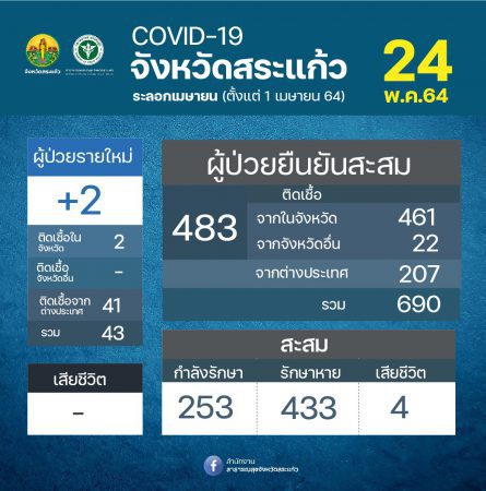 สำหรับสถานการณ์โรค COVID-19 ของจังหวัดสระแก้ว ในวันนี้ที่ 24 พ.ค. 2564 นั้น จังหวัดสระแก้วพบผู้ติดเชื้อรายใหม่ 2 ราย (ติดเชื้อจากในจังหวัด 2 ราย ได้แก่ อำเภออรัญประเทศ 2 ราย) ติดเชื้อจากต่างประเทศ 41 ราย รวมทั้งหมด 43 ราย สะสมจากการระบาดระลอกเมษายน ติดเชื้อในจังหวัด 461 ติดเชื้อจากจังหวัดอื่น 22 ราย ติดเชื้อจากต่างประเทศ 207 ราย รวมทั้งหมดสะสม 690 ราย กำลังรักษาตัวอยู่ 253 ราย รักษาหาย 433 ราย เสียชีวิตสะสมรวม 4 ราย