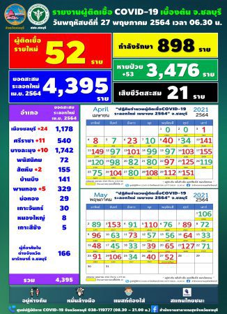 ในวันนี้ 27 พ.ค.64 สสจ.ชลบุรี มีรายงานผู้ติดเชื้อโควิด-19 รายใหม่ จำนวน 52 ราย  1. Cluster ตลาดใหม่ 7 ราย  2. สัมผัสผู้ป่วยยืนยัน (ในครอบครัว เชื่อมโยงตลาดใหม่) 1 ราย  3. สัมผัสผู้ป่วยยืนยัน (ในที่ทำงาน เชื่อมโยงตลาดใหม่) 1 ราย  4. สัมผัสผู้ป่วยยืนยัน (ในที่ทำงาน เชื่อมโยง บริษัท โอคุมุระ) 1 ราย  5. สัมผัสผู้ป่วยยืนยัน (ในที่ทำงาน บริษัท UACJ จ.ระยอง) 1 ราย  6. สัมผัสผู้ป่วยยืนยัน  6.1 ในครอบครัว 5 ราย