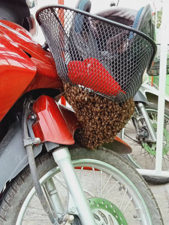 ผึ้งมิ้มบินมาเกาะที่ตะกร้าหน้ารถ จยย.ญาติผู้ป่วยที่มาเยี่ยมญาติเกรงว่าจะได้รับอันตราย