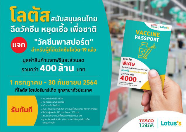 โลตัส เตรียมแจก “วัคซีนพาสปอร์ต” ให้กับประชาชนที่ได้รับการฉีดวัคซีนโควิด-19 เพื่อสนับสนุนให้คนไทยเข้ารับการฉีดวัคซีน โดยวัคซีนพาสปอร์ตประกอบไปด้วยคูปองแลกสินค้าฟรีและส่วนลดรวมมูลค่ากว่า 400 ล้านบาท เริ่มแจกพร้อมกันที่ไฮเปอร์มาร์เก็ตโลตัสทั่วประเทศ 1 กรกฎาคม นี้