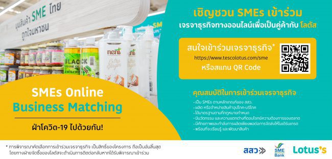 โลตัส ร่วมกับ ธนาคารพัฒนาวิสาหกิจขนาดกลางและขนาดย่อมแห่งประเทศไทย (SME D Bank) และ สำนักงานส่งเสริมวิสาหกิจขนาดกลางและขนาดย่อม (สสว.) จัดการเจรจาธุรกิจการค้า Online Business Matching ในทุกวันศุกร์ที่สามของเดือน เปิดโอกาสให้ผู้ประกอบการรายย่อย SME นำเสนอสินค้าให้กับทีมงานจัดซื้อทุกหมวดหมู่สินค้าของโลตัสโดยตรง สร้างโอกาสในการวางจำหน่ายสินค้าที่สาขาของโลตัส ทั่วประเทศ และช่องทางออนไลน์ หลังกิจกรรม Business Matching ครั้งแรกประสบความสำเร็จ มีผู้ประกอบการ SME ที่ได้รับคัดเลือกและอยู่ในระหว่างการพิจารณา 46 ราย โดยโลตัสเดินหน้าจัดกิจกรรมเจรจาธุรกิจการค้า (Business Matching) ทุกเดือนเพื่อช่วยสนับสนุนผู้ประกอบการรายย่อย ผู้ที่สนใจสามารถดูข้อมูลเพิ่มเติมได้ที่ www.TescoLotus.com/SME