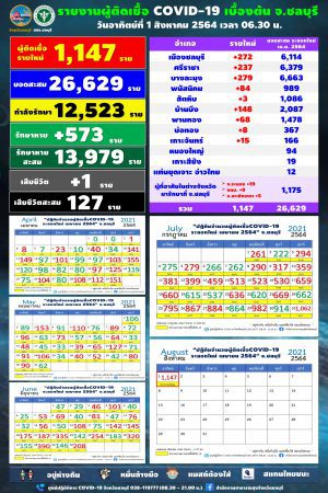 วันนี้ 1 ส.ค.64 สสจ.ชลบุรี มีรายงานผู้ติดเชื้อโควิด-19 รายใหม่ จำนวน 1,147 ราย พบผู้ป่วยขึ้นหลักพันวันที่สอง จาก 1. Cluster บริษัท แด-เอ อีเลคโทรนิคส์ (ประเทศไทย) จำกัด อำเภอบ้านบึง 10 ราย 2. อาชีพเสี่ยงพบปะผู้คนจำนวนมาก 28 ราย 3. สถานประกอบการในจังหวัดระยองหลายแห่ง 13 ราย 4. ต่างจังหวัดเดินทางเข้ามารักษาในจังหวัด (กทม.) 1 ราย 5. ให้ประวัติเดินทางไปต่างจังหวัด 5.1 กทม. 4 ราย 5.2 จังหวัดสมุทรปราการ 1 ราย 6. สัมผัสผู้ป่วยยืนยัน 6.1 ในครอบครัว 262 ราย 6.2 จากสถานที่ทำงาน 152 ราย 6.3 บุคคลใกล้ชิด 53 ราย 6.4 ร่วมวงสังสรรค์ 3 ราย 7. สัมผัสผู้ป่วยยืนยัน (อยู่ระหว่างสอบสวนโรค) 180 ราย 8. อยู่ระหว่างการสอบสวนโรค 440 ราย