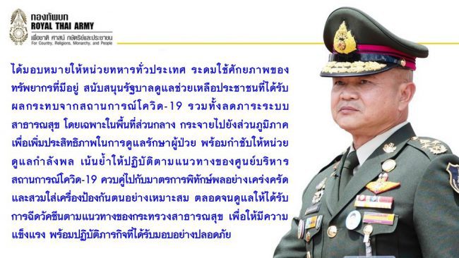 ตามที่ พลเอก ณรงค์พันธ์ จิตต์แก้วแท้ ผู้บัญชาการทหารบก/รองผู้อำนวยการรักษาความมั่นคงภายในราชอาณาจักร ได้มอบหมายให้หน่วยทหารทั่วประเทศ ระดมใช้ศักยภาพของทรัพยากรที่มีอยู่ สนับสนุนรัฐบาลดูแลช่วยเหลือประชาชนที่ได้รับผลกระทบจากสถานการณ์โควิด-19 รวมทั้งลดภาระระบบสาธารณสุข โดยเฉพาะในพื้นที่ส่วนกลาง กระจายไปยังส่วนภูมิภาค เพื่อเพิ่มประสิทธิภาพในการดูแลรักษาผู้ป่วย พร้อมกำชับให้หน่วยดูแลกำลังพล เน้นย้ำให้ปฏิบัติตามแนวทางของศูนย์บริหารสถานการณ์โควิด-19 ควบคู่ไปกับมาตรการพิทักษ์พลอย่างเคร่งครัด และสวมใส่เครื่องป้องกันตนอย่างเหมาะสม ตลอดจนดูแลให้ได้รับการฉีดวัคซีนตามแนวทางของกระทรวงสาธารณสุข เพื่อให้มีความแข็งแรง พร้อมปฏิบัติภารกิจที่ได้รับมอบอย่างปลอดภัย นั้น