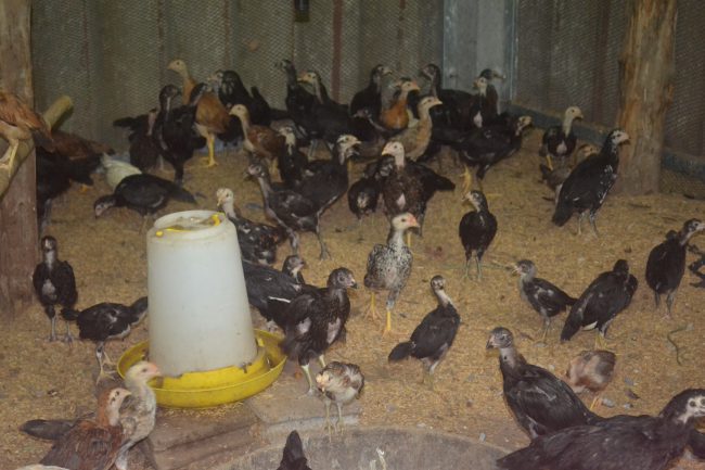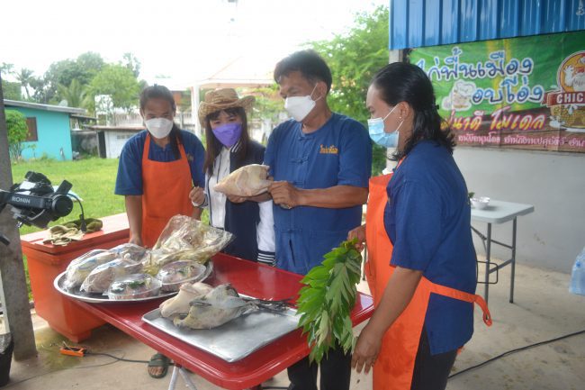 ในขณะเดียวกันกลุ่มก็ตั้งเป็นโรงเรียนเลี้ยงไก่ เพื่อสร้างระบบและเป็นตัวอย่างการเลี้ยงไก่ให้ได้คุณภาพตามต้องการ สร้างเครือข่ายให้กว้างขวาง และเพิ่มรายได้ให้แก่มวลสมาชิกไปด้วย – นาง ดาวเรือง จันทร์เจริญ ผอ.โรงเรียนเลี้ยงไก่พื้นเมือง เล่าว่า เริ่มกิจการนี้มาหลายปี มีแม่พันธ์พ่อพันธุ์ไก่มากว่า 20 คู่ โดยคัดจากไก่ที่เลี้ยงแยกโรงเรือนต่างหาก เมื่อไก่ผสมพันธุ์และแม่ไก่ออกไข่คราวละ 12-15 ฟองจะให้แม่ไก่ฟักตามธรรมชาติ แต่เมื่อฟักเป็นตัวแล้วจะแยกลูกไก่ไปอนุบาลและเลี้ยงต่างหาก แม่ไก่จึงสามารถมีลูกได้ปีละ 4- 6 รุ่น ไก่เล็กจะแยกโรงเรือน และแยกรุ่น ให้ยาป้องกันโรค จนอายุได้ 2 เดือนจะปล่อยให้หากินตามธรรมชาติ ให้อาหารเสริมเป็นข้าวเปลือก เศษผัก รำ หญ้าเนเปีย เป็นต้น จนอายุได้ 6 เดือน สามารถจับขายได้ โดยเนื้อไก่จะมีคุณภาพน้ำหนักตามต้องการคือ 1.5-1.8 กก/ตัว เนื้อไก่จะแน่น ไม่เปื่อยยุ่ย ตลาดต้องการ ทั้งนี้จะมีปศุสัตว์อำเภอเข้ามาช่วยดูแลด้านวิขาการ การป้องกันโรค และตลาดการขายทั้งไนและต่างประเทศ จากสถานการณ์โควิด-19 ระบาดหนักทำให้ตลาดปิดไม่สามารถส่งออกไก่ไปขายประเทศคู่ค้าได้ จึงหันมาเปิดตลาดภายในจังหวัด ด้วยการนำไก่มาชำแหละเป็นไก่เนื้อ ไก่สมุนไพร เครื่องในไก่ ชิ้นส่วนไก่ และไก่อบโอ่งเป็นต้น โดยนำไปขายที่ตลาดนัดชุมชน ท้องถิ่น ซึ่งปรากฏว่าขายได้ดี เป็นที่ต้องการของตลาดผู้บริโภคทำรายได้ให้เกษตรกรผู้เลี้ยงไก่ไม่น้อยเลยในช่วงโควิด-19