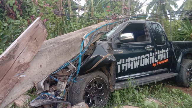 ลุงวัย 60 ซิ่งกระบะหลับในเสียหลักพุ่งลงข้างทางก่อนพุ่งไฟชนเสาไฟฟ้าล้มระเนระนาด 2 ต้น รอดตายหวุดหวิด