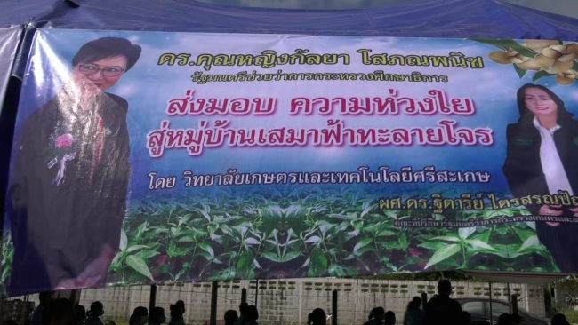 ผู้ช่วยศาสตราจารย์ ดร.ฐิตารีย์ ไตรสรณปัญญา (ดร.จุ๋ม) คณะที่ปรึกษารัฐมนตรีว่าการกระทรวงเกษตรและสหกรณ์ กล่าวว่า ในวันนี้ตนเองได้เดินทางมามอบฟ้าทะลายโจร” ให้แก่โรงเรียนราชประชานเคราะห์ที่ 29 จังหวัดศรีสะเกษ เพื่อให้นักเรียนนำไปปลูกในแปลงสาธิตของโรงเรียน เพื่อขยายพันธุ์และแปรรูปในการป้องกันโรคติดเชื้อไวรัสโควิด-19 ซึ่งเป็นโครงการของ ดร.คุณหญิงกัลยา โสภณพนิช รัฐมนตรีช่วยว่าการกระทรวงศึกษาธิการ ที่ส่งมอบความห่วงใย ไปยังหมู่บ้านสีฟ้าเสมา ฟ้าทะลายโจร เพื่อส่งเสริมสนับสนุนให้พี่น้องเกษตรกรและประชาชนทั่วไป ได้มีโอกาสปลูกพืชสมุนไพร ที่เป็นพืชสมุนไพรซึ่งอยู่กับคนไทยมาช้านาน เป็นสมุนไพร ที่สามารถนำมากินเพื่อป้องกันโรคโควิด ที่กำลังแพร่ระบาดอยู่ในขณะนี้ได้ และเป็นพืชเศรษฐกิจ ที่สามารถเติบโตได้ในอนาคต
