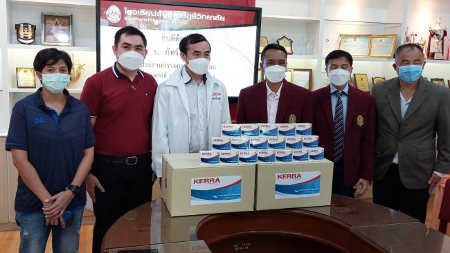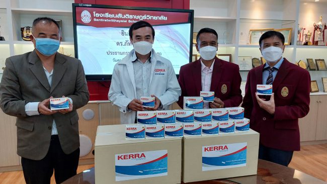 วันที่ 13 สิงหาคม 64 นายภัทร หนังสือ ประธานกรรมการ บริษัท อีสเทิร์นเฮิร์บ และเวชกรโอสถผลิตภัณฑ์สมุนไพรเคอร่า (Kerra) พร้อมทีมงาน ลงพื้นที่นำยาสมุนไพรเคอร่า จำนวน 300 กล่อง มามอบให้กับทางสมาคมผู้ปกครองและครูโรงเรียนสันติราษฎร์วิทยาลัย เพื่อป้องกันการติดเชื้อไวรัสโควิด-19 โดย พ.ต.อ.กิตติศักดิ์ ปลาทอง นายกสมาคมผู้ปกครองและครูโรงเรียนสันติราษฎร์วิทยาลัย ได้บอกกล่าวและแนะนำยาสมุนไพรเคอร่า  โดยในวันนี้ นายสุพจน์ จันตราชู และ นายศักดา พึ่งเจียม รองผู้อำนวยการโรงเรียนสันติราษฏร์วิทยาลัย   เป็นผู้รับมอบ เพื่อนำไปใช้ประโยชน์ในการป้องกันและยับยั้งหากเกิดอาการของโรคติดเชื้อไวรัสโควิด-19 ต่อไป