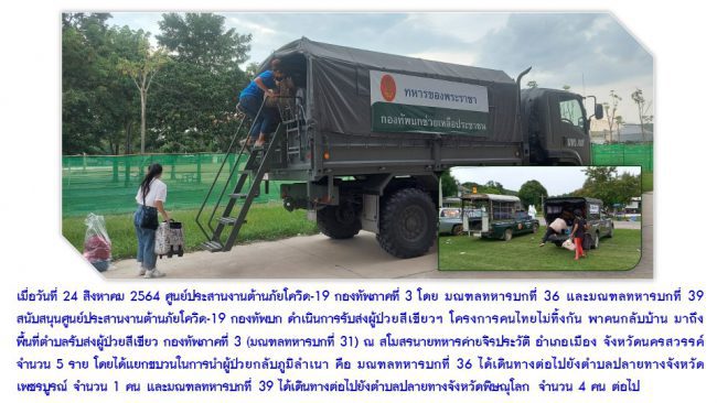 – เมื่อวันที่ 24 สิงหาคม 2564 ศูนย์ประสานงานต้านภัยโควิด-19 กองทัพภาคที่ 3 โดย มณฑลทหารบกที่ 36 และมณฑลทหารบกที่ 39 สนับสนุนศูนย์ประสานงานต้านภัยโควิด-19 กองทัพบก ดำเนินการรับส่งผู้ป่วยสีเขียวฯ โครงการคนไทยไม่ทิ้งกัน พาคนกลับบ้าน มาถึงพื้นที่ตำบลรับส่งผู้ป่วยสีเขียว กองทัพภาคที่ 3 (มณฑลทหารบกที่ 31) ณ สโมสรนายทหารค่ายจิรประวัติ อำเภอเมือง จังหวัดนครสวรรค์ จำนวน 5 ราย โดยได้แยกขบวนในการนำผู้ป่วยกลับภูมิลำเนา คือ มณฑลทหารบกที่ 36 ได้เดินทางต่อไปยังตำบลปลายทางจังหวัดเพชรบูรณ์ จำนวน 1 คน และมณฑลทหารบกที่ 39 ได้เดินทางต่อไปยังตำบลปลายทางจังหวัดพิษณุโลก จำนวน 4 คน ต่อไป