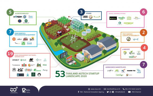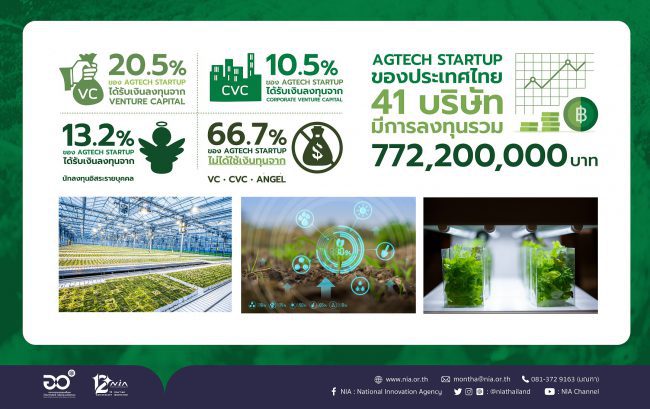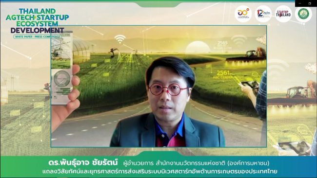 ดร. พันธุ์อาจ ชัยรัตน์ ผู้อำนวยการ สำนักงานนวัตกรรมแห่งชาติ (องค์การมหาชน) เปิดเผยว่า NIA ได้ร่วมกับมหาวิทยาลัยแม่โจ้จัดทำ “สมุดปกขาวการขับเคลื่อนพัฒนาระบบนิเวศสตาร์ทอัพด้านการเกษตรของประเทศไทย” ขึ้นเป็นครั้งแรกโดยการสำรวจและวิเคราะห์ข้อมูลทุกภาคส่วนที่เกี่ยวข้อง เพื่อนำไปสู่การกำหนดกรอบนโยบายที่สามารถนำไปปฏิบัติให้เกิดขึ้นได้จริงอย่างมีทิศทาง พร้อมเรียนรู้ประสบการณ์เพื่อปรับบริบทให้เหมาะกับภาคเกษตรไทย จากผลการสำรวจพบข้อมูลที่น่าสนใจและเป็นประโยชน์ในหลายมิติ โดยใน พ.ศ. 2563 มีสตาร์ทอัพด้านการเกษตร จำนวน 53 ราย (กลุ่มเทคโนโลยีการบริหารจัดการฟาร์ม เซนเซอร์ และระบบ IoT มีจำนวนสูงสุด) อายุธุรกิจเฉลี่ย 4.7 ปี สามารถแบ่งเป็นระยะเริ่มต้น (Seed State) ร้อยละ 52.5 ระยะทดสอบไอเดีย (Pre-seed) ร้อยละ 27.5 และระยะเติบโตอย่างรวดเร็ว (Growth) ร้อยละ 20 ซึ่งจะกระจายตัวในกรุงเทพฯ และปริมณฑล
