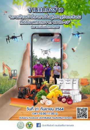 กรมส่งเสริมการเกษตร เตรียมแถลงข่าวความก้าวหน้าโครงการเพื่อฟื้นฟูเศรษฐกิจและสังคมที่ได้รับผลกระทบจาก Covid-19 นำเสนอตัวอย่างความสำเร็จของเกษตรกรที่เข้าร่วมโครงการ ผ่านช่องทางออนไลน์