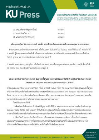 มติที่ประชุมสภามหาวิทยาลัยเกษตรศาสตร์ อนุมัติจัดตั้งศูนย์นวัตกรรมวัคซีนและชีวภัณฑ์ มหาวิทยาลัยเกษตรศาสตร์ (Kasetsart Vaccines and Biologies Innovation Centre)