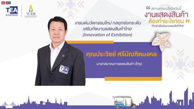ด้านนายประวิชย์ ศรีบัณฑิตมงคล นายกสมาคมการแสดงสินค้า (ไทย) กล่าวว่า “สิ่งที่พวกเราในฐานะของผู้ประกอบการในอุตสาหกรรมการแสดงสินค้าได้ปฏิบัติกันมาตามมาตรการปกติใหม่หรือ (New Normal) ในปีที่ผ่านมา จะกลายเป็นสิ่งที่เราจะต้องปฏิบัติกันต่อเนื่องต่อไป พร้อมด้วยการควบคุมจากมาตรการเพิ่มเติมในสถานการณ์ปัจจุบัน ซึ่งหมายถึงจะเป็นมาตรการปกติปัจจุบัน (Now Normal) ไปแล้ว และจะต้องคงอยู่กับเราไปอีกระยะยาว เพื่อทำให้กิจการและกิจกรรมของอุตสาหกรรมการแสดงสินค้าของไทย สามารถอยู่ร่วมกับเชื้อไวรัสโควิด 19 ได้อย่างกลมกลืน เราไม่สามารถปฏิเสธได้ว่าเศรษฐกิจของประเทศจะต้องดำเนินต่อไป และการจัดงานแสดงสินค้า หรือการประชุมต่าง ๆ ซึ่งเป็นตัวจักรสำคัญในการขับเคลื่อนเศรษฐกิจที่สำคัญในช่วงเวลาที่ผ่านมานั้น จะต้องทำหน้าที่ต่อไป ไม่ว่าสถานการณ์โควิดจะหมดไปหรือไม่ก็ตาม สมาคมการแสดงสินค้า (ไทย) ได้วางแนวทางให้ผู้ประกอบการสามารถดำเนินกิจกรรมต่อไปได้อย่างปลอดภัย ด้วยมาตรการปกติปัจจุบัน พร้อมทั้งการนำนวัตกรรม และวิทยาการด้านดิจิทัลที่ผู้ประกอบการได้ปรับใช้กันอยู่ในปัจจุบัน มาเป็นหนึ่งกลยุทธ์ที่จะผลักดันให้อุตสาหกรรมการแสดงสินค้าสามารถกลับมาทำหน้าที่ในการขับเคลื่อนเศรษฐกิจของประเทศต่อไปได้อย่างสมบูรณ์”
